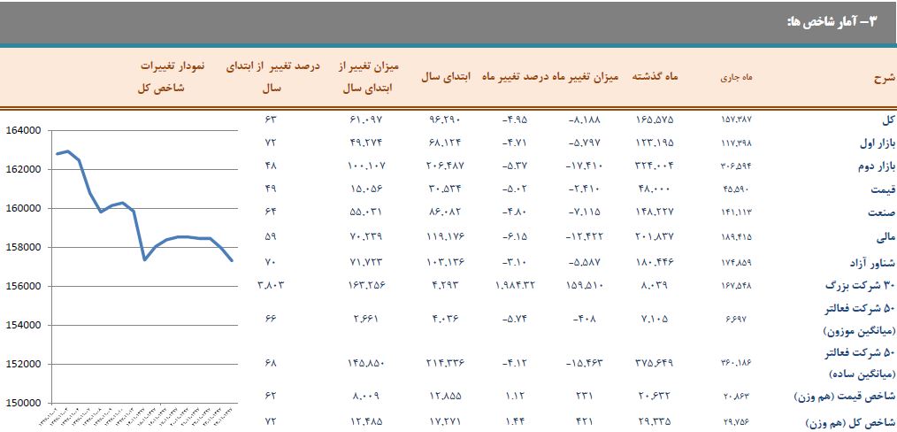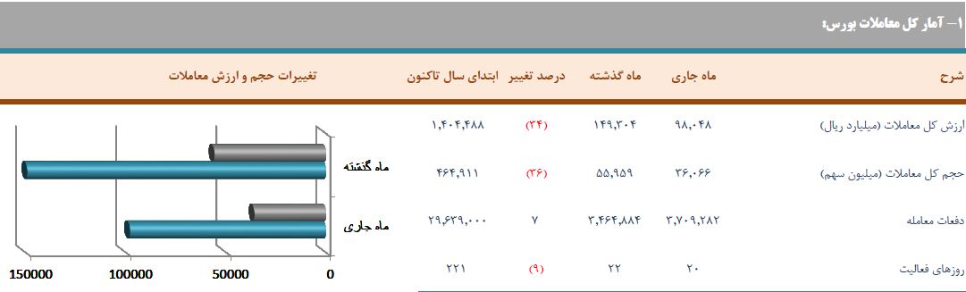 در پایان معاملات بهمن ماه ۹۷، شاخص کل با ۸.۱۸۸ واحد افزایش نسبت به دی ۹۷، به رقم ۱۵۷.۳۸۷ واحد رسید که ۵ درصد افزایش را نشان می دهد. همچنین شاخص بازار اول با ۵.۷۹۷ واحد افزایش به رقم ۱۱۷.۳۹۸ واحد رسید و شاخص بازار دوم با ۱۷.۴۱۰ واحد افزایش به ۳۰۶.۵۹۴ واحد رسید و به ترتیب با ۴.۷۱ درصد و ۵.۳۷ درصد کاهش نسبت به ماه قبل مواجه شدند.