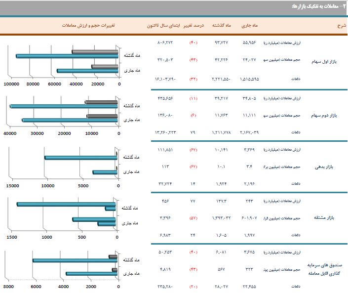 از سویی دیگر، در دومین ماه از زمستان ۹۷، ارزش کل معاملات اوراق بهادار به ۹۸.۰۴۸ میلیارد ریال رسید که نسبت به دی ۹۷ به میزان ۳۴ درصد کاهش یافته است. افزون بر این در این دوره مالی، تعداد ۳۶.۰۶۶ میلیون انواع اوراق بهادار در بیش از ۳ میلیون و ۷۰۹ هزار دفعه مورد معامله قرار گرفت و به ترتیب ۳۶ درصد کاهش و ۷ درصد افزایش را نسبت به ماه گذشته تجربه کرد.