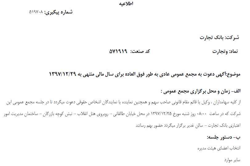 افزون بر این، کلیه سهامداران، وکیل یا قائم مقام قانونی صاحب سهم و یا نماینده یا نمایندگان اشخاص حقوقی می توانند برای شرکت در جلسه مجمع عمومی عادی بطور فوق العاده بانک تجارت ساعت ۸ صبح و جلسه مجمع عمومی فوق العاده ساعت ۸:۳۰ صبح روز شنبه ۲۵ اسفند ۹۷ به نشانی تهران، خیابان طالقانی - روبروی هتل انقلاب - نبش کوچه بازرگان - ساختمان مدیریت امور اعتباری بانک تجارت - سالن غدیر مراجعه کنند.