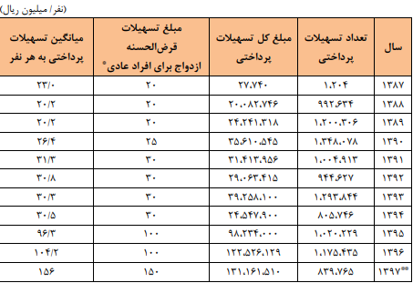به گزارش خبرنگار ایبِنا، پرداخت تسهیلات قرضالحسنه یکی از سیاستهای دولت در حمایت از ازدواج جوانان از سالهای ابتدایی دهه ۸۰ تاکنون بوده است. از انتهای سال ۸۷ همزمان با افزایش مبلغ تسهیلات قرضالحسنه ازدواج از ۱۰ به ۲۰ میلیون ریال، پرداخت این تسهیلات در قالب سامانه متمرکز تسهیلات قرضالحسنه ازدواج پیگیری شده است. تعداد، مجموع و میزان تسهیلات قرضالحسنه پرداخت شده در سالهای اخیر در جدول زیر آمده است: