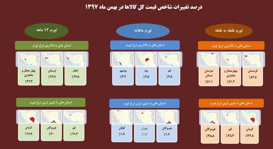 از سوی دیگر محاسبه درصد تغییرات شاخص قیمت کل کالاها در بهمن ماه بر اساس تورم ۱۲ ماهه نشان میدهد که استان های ایلام با ۲۷.۸ درصد، لرستان با ۲۷.۹ درصد و چهارمحل و بختیاری با ۲۷.۳ درصد بالاترین افزایش قیمت ها را نسبت به سایر استان ها داشته اند.