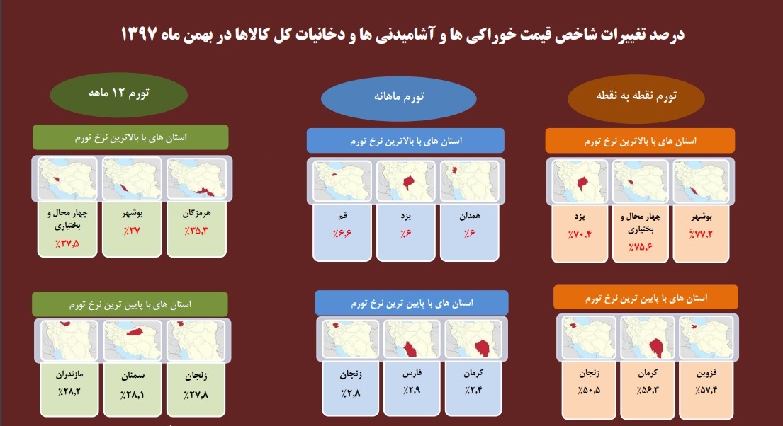همچنین در شاخص تورم ۱۲ ماهه خوراکی ها، آشامیدنی ها و دخانیات در کل کشور برای بهمن ماه ۹۷، چهارمحل و بختیاری با ۳۷.۵ درصد، بوشهر با ۳۷ درصد و هرمزگان با ۳۵.۳ درصد بالاترین رشد قیمت ها در کشور را از آن خود کرده اند.