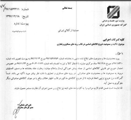 همچنین گمرکات مرز خروج ترتیبی اتخاذ کنند تا از خروج کالاهای مذکور در قالب اظهار خلاف واقع یا در جوف کالاهای صادراتی دیگر جلوگیری به عمل آید.