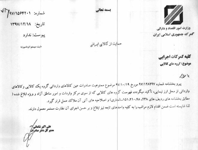 از سویی دیگر گمرک در اطلاعیه ای دیگر اعلام کرد: پیرو ممنوعیت صادرات عین کالاهای وارداتی گروه یک کالایی و کالاهای وارداتی گروه یک کالایی و کالاهای وارداتی از محل ارز نیمایی تاکید می شود که فهرست گروه های کالایی که از سوی مرکز واردات و امور مناطق آزاد و ویژه ابلاغ شده و اصلاحیه های آتی آن ملاک عمل قرار گیرد.