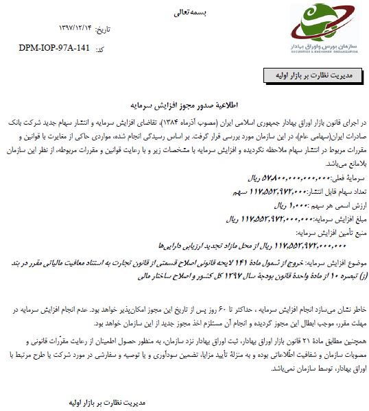 لازم به ذکر است، افزایش سرمایه این بانک حداکثر تا ۶۰ روز از تاریخ این مجوز امکان‌پذیر خواهد بود. عدم انجام افزایش سرمایه در مهلت مقرر، موجب ابطال این مجوز شده و انجام آن مستلزم اخذ مجوز جدید از این سازمان خواهد بود.