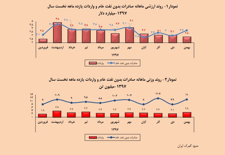 از لحاظ وزنی نیز در ۱۱ ماهه نخست امسال نسبت به مدت مشابه سال ۹۶، میزان صادرات و واردات به ترتیب ۶.۴ و ۱۷.۴ درصد کاهش داشته است.
