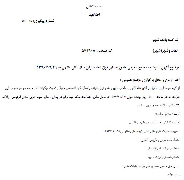 لازم به ذکر است، انتخاب اعضای هیات مدیره، تصویب صورتهای مالی سال (دوره) مالی منتهی به ۲۹ اسفند ۹۶، استماع گزارش هیات مدیره و بازرس قانونی وانتخاب حسابرس و بازرس قانونی، دستور جلسه مجمع عمومی عادی بطور فوق العاده بانک شهر اعلام شده است.
