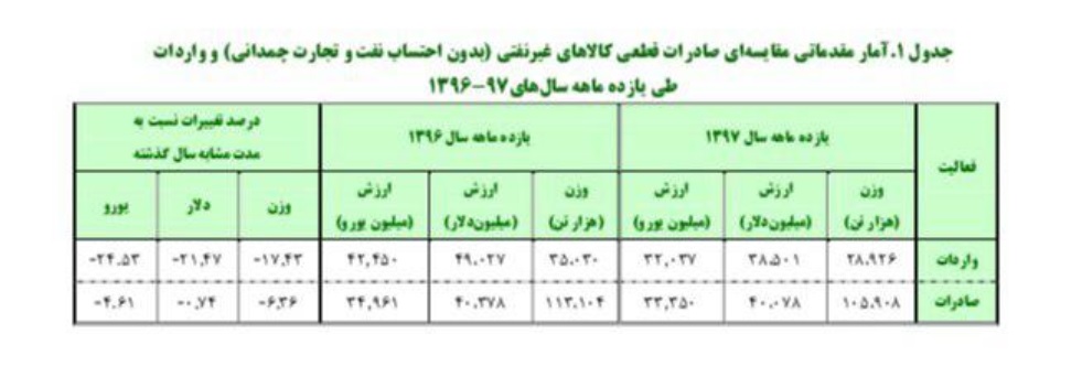 آمار مقایسه ای صادرات امسال با سال گذشته حاکی از آن است که صادرات از نظر وزنی ۶.۳۶ درصد و از نظر ارزش دلاری ۰.۷۴ درصد کاهش داشته است. همچنین میزان واردات کشور در این مدت با کاهشی ۱۷.۴۳ درصدی در وزن و ۲۱.۴۷ درصدی در ارزش دلاری روبرو بوده است. براین اساس در مقایسه با مدت مشابه سال قبل، واردات ۲۸ هزار و ۹۲۶ هزار تن و ۳۸ میلیارد و ۵۰۱ میلیون دلار بوده است.