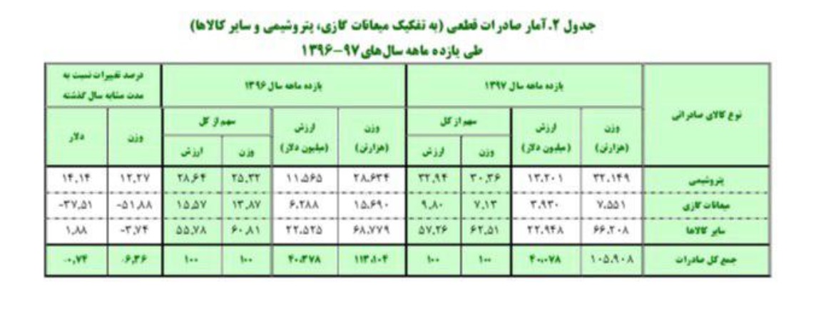 سایر کالاهای صادراتی نیز از ابتدای سال ۹۷ تا پایان بهمن ماه از نظر وزنی ۶۶.۲۸۰ هزار تن و از نظر ارزشی ۲۲ میلیارد و ۹۴۸ میلیون دلار بوده است. این میزان صادرات از نظر وزنی ۳.۷۴ درصد کاهش و از نظر ارزشی ۱.۸۸ درصد رشد داشته است. بر این اساس جمع کل صادرات از نظر وزنی ۱۰۵.۹۰۸ هزار تن و از نظر ارزشی ۴۰ میلیارد و ۷۸ میلیون دلار بوده است.