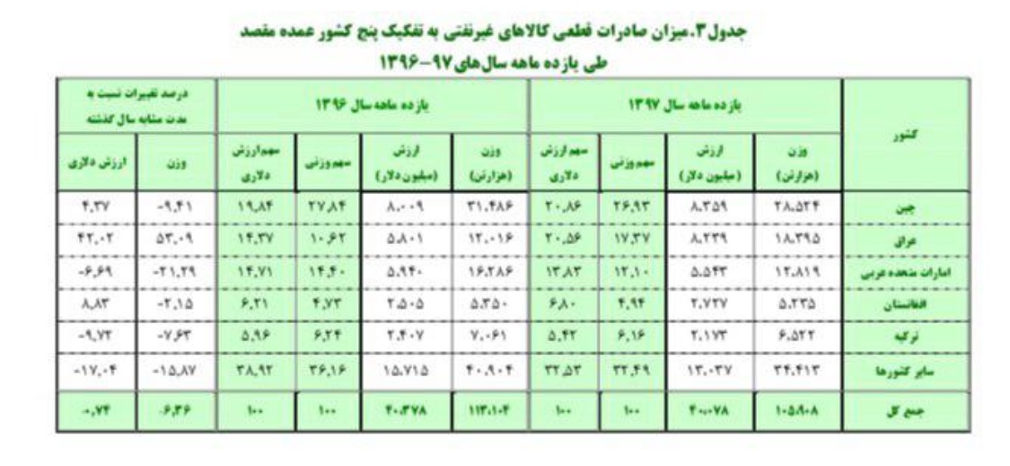 براساس آمار مقدماتی منتشر شده، میزان صادرات قطعی کالاهای غیرنفتی به تفکیک پنج کشور عمده مقصد در ۱۱ ماهه امسال چین، عراق، امارات متحده عربی، افغانستان و ترکیه بوده اند. این آمار حاکی از آن است که صادرات به چین از نظر وزنی ۲۸.۵۲۴ هزار تن و به ارزش ۸ میلیارد و ۳۵۹ میلیون دلار بوده است. این میزان صادرات از نظر وزنی ۹.۴۱ درصد نسبت به مدت مشابه سال قبل از آن کاهش و از نظر ارزش دلاری ۴.۲۷ درصد افزایش نشان می دهد.