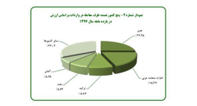 بر این اساس، سهم واردات ایران در ۱۱ ماهه امسال از چین ۲۴.۳۵ درصد، از امارات ۱۵.۳۷ درصد، از ترکیه ۵.۸۷ درصد، از هند ۵.۷۴ درصد، از آلمان ۵.۶۵ درصد و از سایر کشورها ۴۳.۰۲ درصد بوده است.