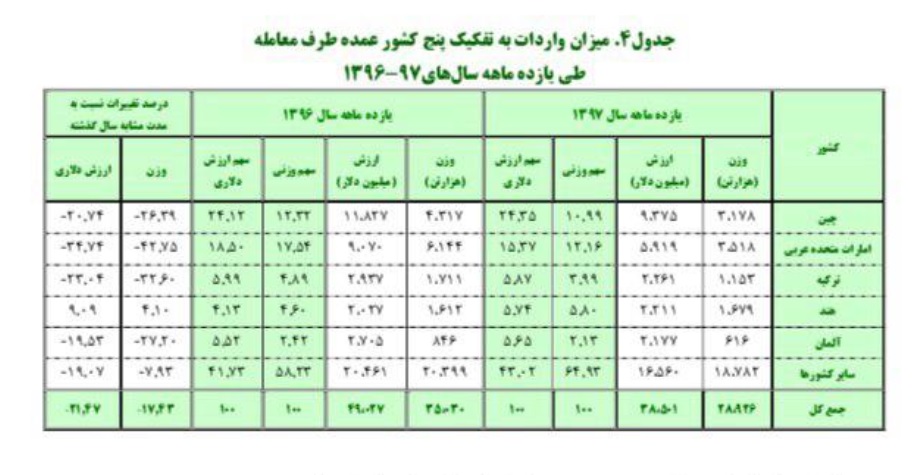 ترکیه نیز در مدت مشابه ۱.۱۵۳ هزار تن کالا به ارزش دو میلیارد و ۲۶۱ میلیون دلار به ایران صادر کرده است. این ارقام از نظر وزنی ۳۲.۶۰ و از نظر ارزش دلاری ۲۳.۰۴ درصد در مقایسه با مدت مشابه اُفت کرده است.