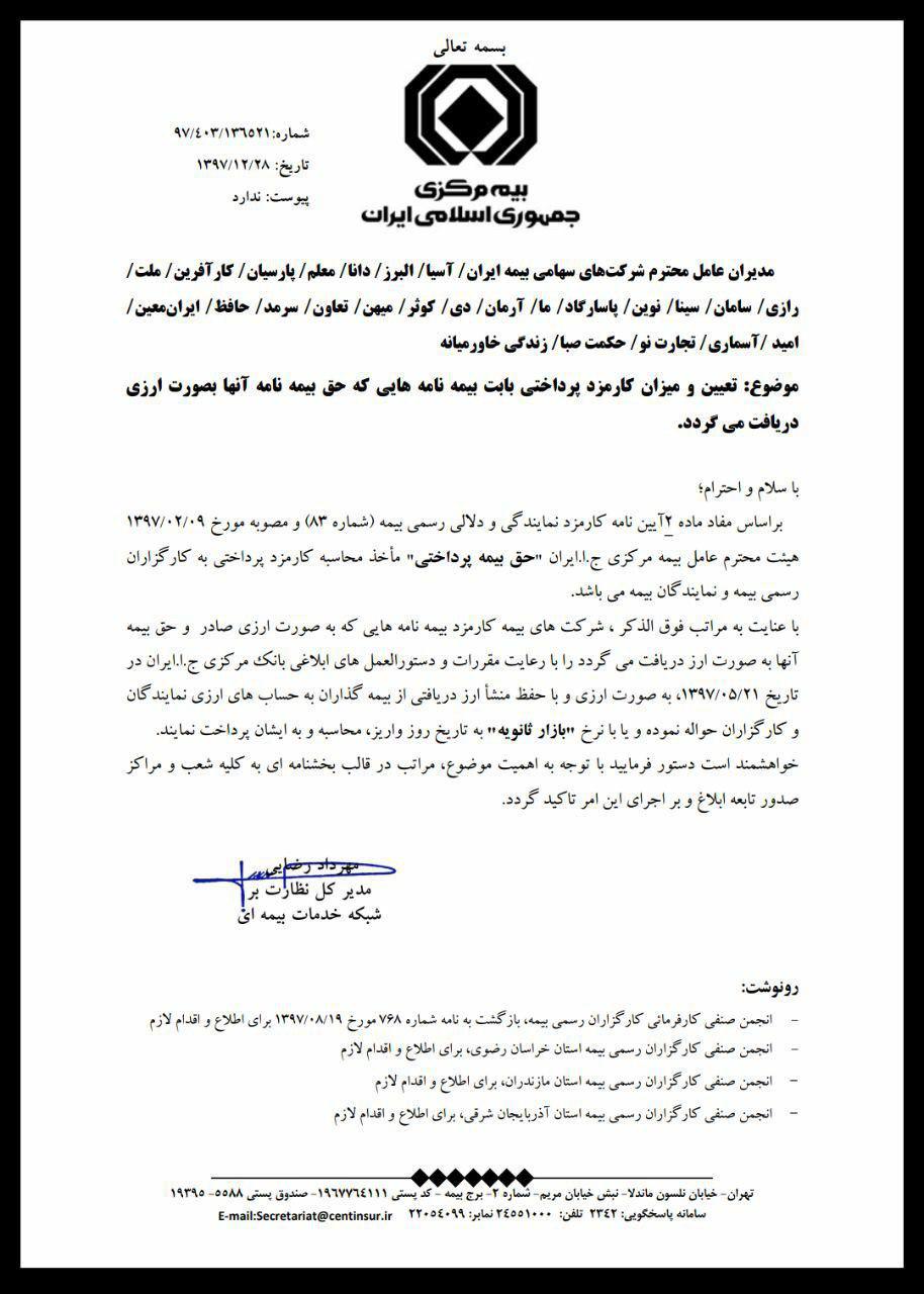 در ادامه این بخشنامه آمده است: شرکت های بیمه کارمزد بیمه نامه هایی که به طور ارزی صادر و حق بیمه آنها به صورت ارز دریافت می شود را با رعایت مقررات و دستورالعمل های ابلاغی بانک مرکزی در تاریخ ۲۱ مرداد ۱۳۹۷ به صورت ارزی و با حفظ منشا ارز دریافتی از بیمه گذاران به حساب های ارزی نمایندگان و کارگزاران حواله کرده یا با نرخ «بازار ثانویه» به تاریخ روز واریز، محاسبه و به ایشان پرداخت کنند.