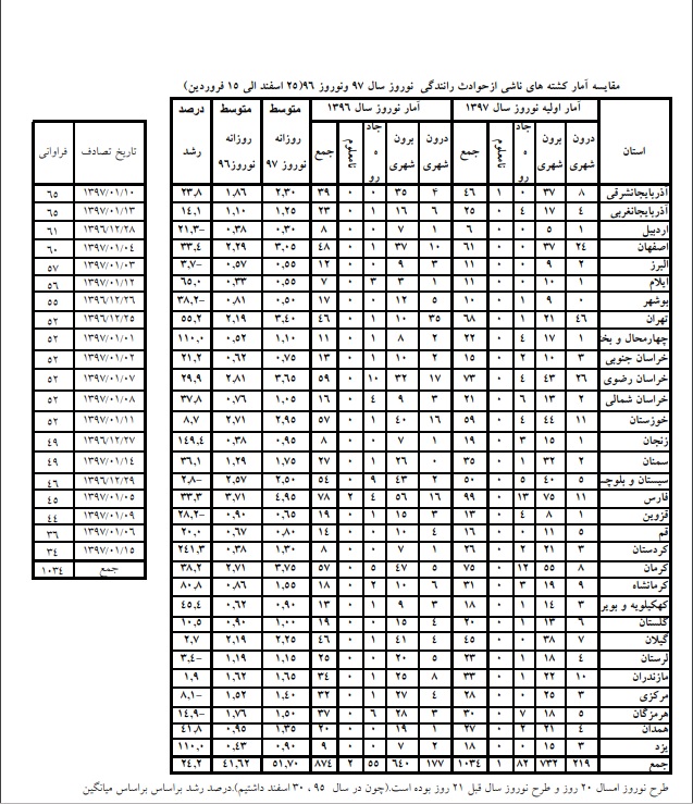 با توجه به این آمار، میانگین تعداد افراد کشته شده بر اثر تصادفات رانندگی در نوروز امسال ۵۱.۷۰ نفر بوده که این رقم برای سال قبل از آن ۴۱.۶۲ محاسبه شده است. البته پزشکی قانونی توضیح داده است که طرح نوروز امسال ۲۰ روز و طرح نوروز سال قبل ۲۱ روز بوده است که دلیل آن نیز وجود سال کبیسه در سال ۱۳۹۵ بوده است. همچنین این سازمان درصد رشد را براساس میانگین روزانه محاسبه کرده است.
