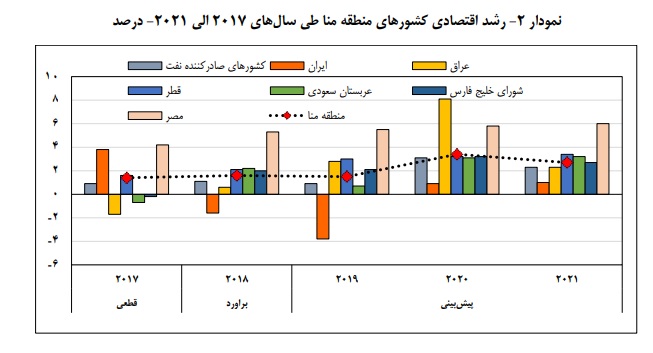 بر این اساس بیشترین رشد اقتصادی متعلق به کشورهای مصر، جیبوتی و عراق خواهد بود و ضعیف ترین رشد اقتصادی نیز متعلق به کشور ایران و در محدوده منفی ۳.۸ تا مثبت یک درصد خواهد بود.