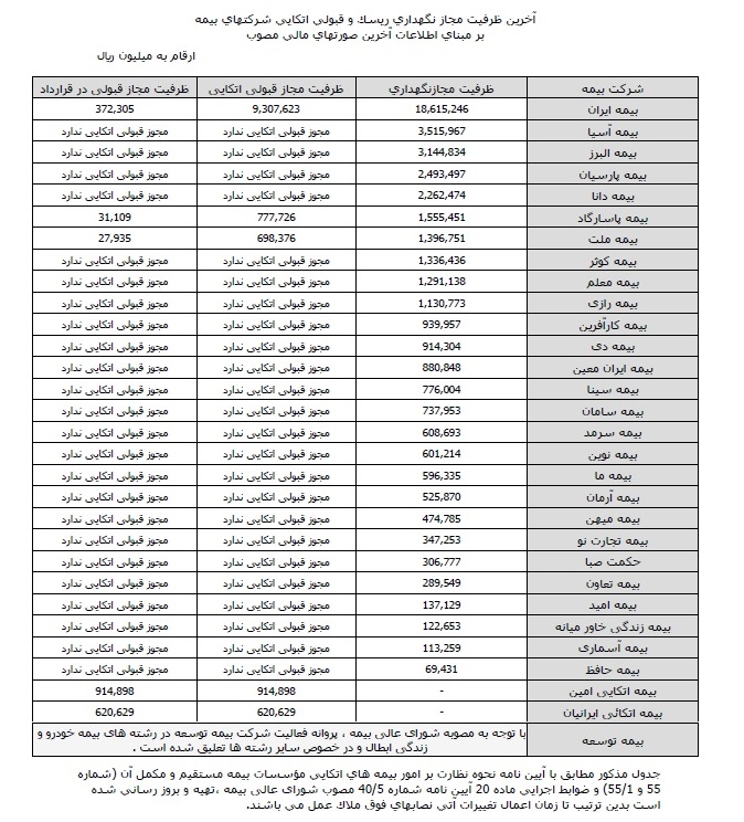 براساس آمار منتشره در جدول بیمه مرکزی، ظرفیت مجاز قبولی اتکایی در قرارداد برای بیمه ایران ۳۷۲ هزار و ۳۰۵ میلیون ریال، برای بیمه پاسارگاد ۳۱ هزار و ۱۰۹ میلیون ریال و برای بیمه ملت ۲۷ هزار و ۹۳۵ میلیون ریال است.