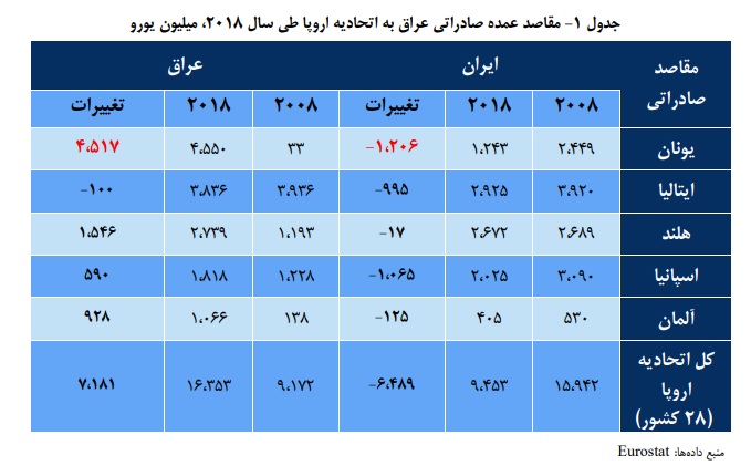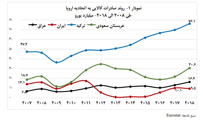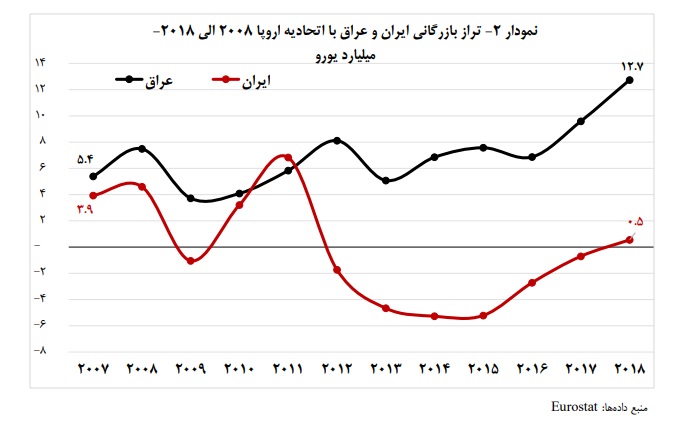 تراز بازرگانی ایران با اتحادیه اروپا طی سال های ۲۰۰۷ تا ۲۰۱۸ حدود ۳.۴ میلیارد یورو کاهش یافته؛ در حالی که طی این مدت تراز بازرگانی عراق با اتحادیه اروپا حدود ۷.۳ میلیارد یورو به نفع عراق افزایش داشته است. شیب تند بهبود تراز بازرگانی عراق طی سه سال اخیر می تواند بازتاب تلاش عراق برای توسعه روابط تجاری خود با کشورهای اروپایی باشد.