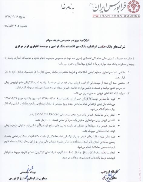 همچنین این گزارش می افزاید: فرابورس با صدور یک اطلاعیه مرتبط دیگر که بهنام محسنی معاون بازارهای خارج از بورس و افسانه اروجی معاون بازار فرابورس آن را امضا کرده اند، اعلام کرد با توجه به مصوبات شورای عالی هماهنگی اقتصادی (سران سه قوه)، در خصوص چارچوب ادغام بانک ها و موسسات اعتباری وابسته به نیروهای مسلح در بانک سپه، سهامداران باید همه اطلاعات و شرایط منتشره در کدال تصمیم گیری خود مدنظر قرار دهند.