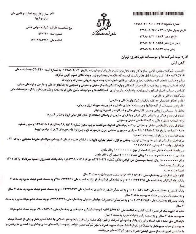 شرکت سهامی خاص ساز و کار ویژه تجارت و تامین مالی ایران و اروپا با سرمایه اولیه یک میلیارد ریال و به مدیرعاملی علی اصغر نوری در اداره ثبت شرکت‌ها و موسسه‌های غیرتجاری تهران به ثبت رسید.