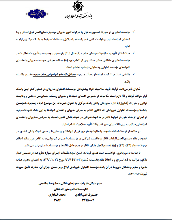 تصدی سمت مدیران و یا عضویت در کمیته‌های مؤسسه اعتباری و تمدید دوره مسئولیت آنها منوط به اخذ تاییدیه صلاحیت از بانک مرکزی است.