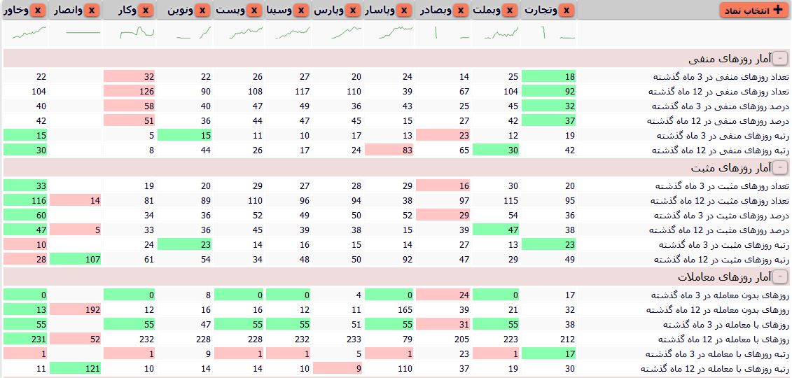 از سویی دیگر، تعداد روزهای منفی معاملاتی بانک ملت ۲۵ روز، بانک تجارت ۱۸ روز، بانک صادرات ۱۴ روز، بانک پارسیان ۲۰ روز، بانک سینا ۲۷ روز، پست بانک ۲۶ روز، بانک کارآفرین ۳۲ روز و بانک اقتصاد نوین ۲۲ روز در آمارهای این دوره زمانی به ثبت رسیده است.