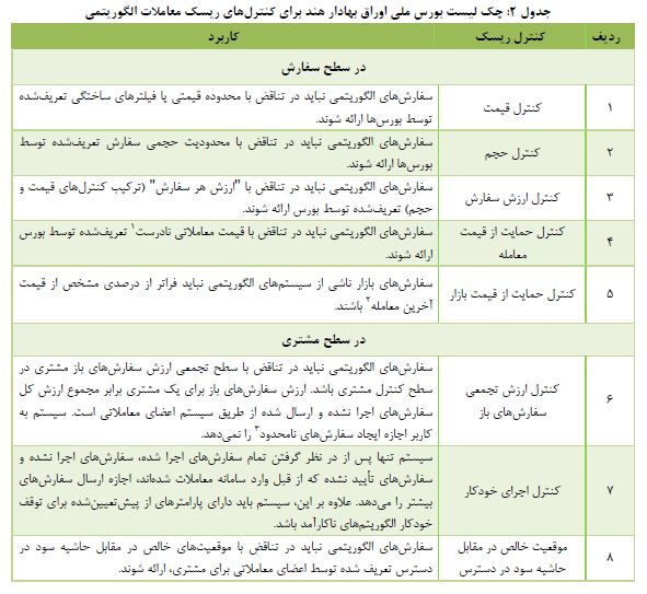 بورسهای اوراق بهادار نیز بهمنظور حصول اطمینان از حفظ منظم معاملات و یکپارچگی بازار، باید دارای سیستم مناسبی برای شناسایی الگوریتمهای ناکارآمد و نادرست بوده و در صورت لزوم اقداماتی را در این راستا انجام دهند. همچنین نهادهای ناظر یا بورسهای اوراق بهادار میتوانند جزئیات استراتژیهای معاملاتی را که توسط الگوریتمها استفاده میشود برای اهداف نظارتی و تحقیقاتی پیگیری کنند.