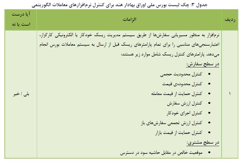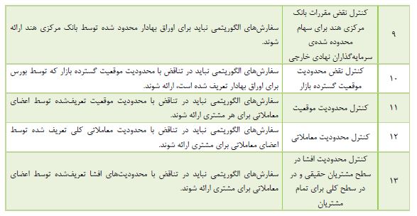 همچنین نهادهای ناظر به منظور تسلط بهتر بر جریان ثبت سفارش و ردگیری موقعیتهای معاملاتی، الزاماتی را بر الگوریتمها و استراتژیهای مورد استفادهی شرکتها وضع کردهاند.