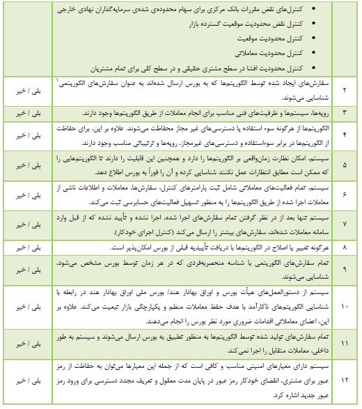 بدین منظور شرکتها باید برای بازبینی و تستکردن هر یک از الگوریتمهای معاملاتی مورد استفادهی خود و همچنین توسعه، بهکارگیری و نظارت بعد از اجرای استراتژیهای معاملاتی، دارای سیاستها و رویههای مناسب باشند. همچنین شرکتهای فعال در معاملات الگوریتمی باید برای تأیید الگوریتمهای مورد استفادهی خود، مجوز لازم را از بورس اوراق بهادار دریافت کنند.