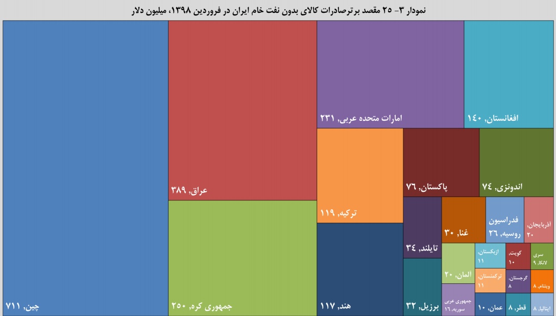 چین بزرگترین مقصد عمده صادرات کالای بدون نفت خام ایران با ارزش صادرات ۷۱۱ میلیون دلار بوده که ۲۸ درصد از کالای بدون نفت خام ایران به این کشور صادر شده است. پس از چین، کشورهای عراق با ۳۸۹ میلیون دلار و کره جنوبی با ۲۵۰ میلیون دلار به ترتیب مقاصد عمده صادراتی ایران در ماه نخست سال ۹۸ بوده اند. حدود ۱۵ درصد از کالای بدون نفت خام ایران در فروردین ماه امسال به کشور عراق و حدود ۱۰ درصد آن به کشور کره جنوبی صادر شده است.