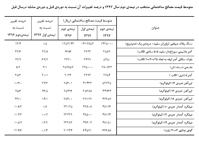 همچنین، مقایسه متوسط قیمت در این دوره با دوره مشابه سال قبل نشان میدهد که بیشترین افزایش قیمت مربوط به «ورق استیل» با٣٣٥,٤ درصد و کمترین افزایش قیمت مربوط «مخلوط شن و ماسه رودخانهای- تونان» با ٢.٣ درصد بوده است.