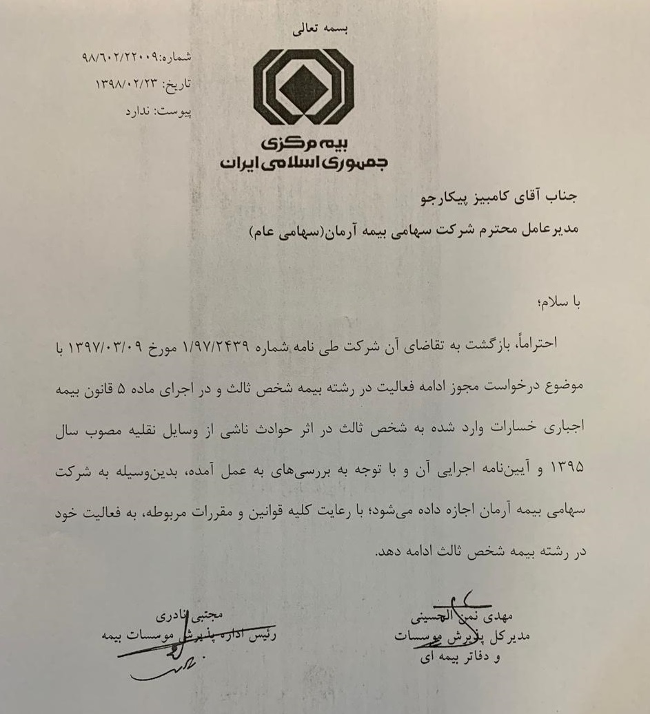 در نامه ای که مهدی نمن الحسینی مدیرکل پذیرش موسسات و دفاتر بیمه ای و مجتبی نادری رئیس اداره پذیرش موسسات بیمه، بیمه مرکزی برای کامبیز پیکارجو مدیرعامل بیمه آرمان در این خصوص ارسال کرده اند، آمده است: بازگشت به تقاضای آن شرکت در تاریخ نهم خردادماه ۱۳۹۷، با موضوع درخواست مجوز ادامه فعالیت در رشته بیمه شخص ثالث و در اجرای ماده ۵ قانون بیمه اجباری خسارات وارد شده به شخص ثالث در اثر حوادث ناشی از وسایل نقلیه مصوب سال ۱۳۹۵ و آیین نامه اجرایی آن و با توجه به بررسی های به عمل آمده، بدین وسیله به شرکت سهامی بیمه آرمان اجازه داده می شود با رعایت تمامی قوانین و مقررات مربوطه به فعالیت خود در رشته بیمه شخص ثالث ادامه دهد.