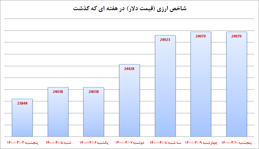 همچنین در معاملات روز سه شنبه، نرخ فروش دلار آمریکا در صرافی های بانکی و مجاز به رقم ۲۴۹۲۳ تومان رسید که بازهم نشان از افزایش به میزان ۴۹۵ تومان داشت. در ادامه هفته، فعالان ارزی در پنجمین روز هفته، با رشد اندک دلار همراه شدند. به گونه ای که در این روز، نرخ فروش دلار آمریکا در صرافی های بانکی و مجاز به رقم ۲۴۹۷۹ تومان رسید و در نهایت، در ایستگاه پایانی هفته، شاخص ارزی بدون تغییر نسبت به روز قبل بود و به رقم ۲۴۹۷۹ تومان بسنده کرد.
