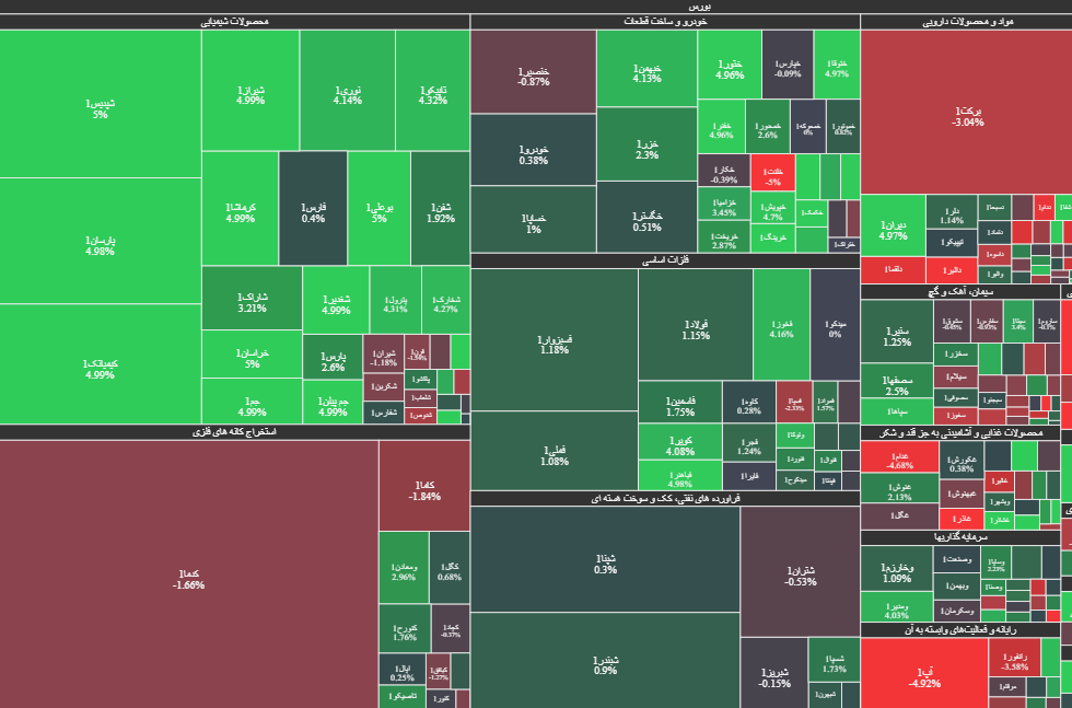 در بازار امروز، بیشترین افزایش قیمت متعلق به نماد غشصفا(شیرپاستوریزه‌پگاه‌اصفهان‌) با ۵ درصد رشد و پس از آن، نمادهای بالبر، لپارس، شسینا و شغدیر بود. همچنین نماد معاملاتی کپشیر(پشم‌شیشه‌ایران‌) با ۴.۹۲ درصد، بیشترین کاهش قیمت را داشت و پس از آن نیز، نمادهای لابسا، غدام، ولملت و غاذر قرار گرفتند.
